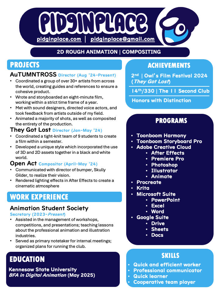 How's it going?My name is Quinci Saunders but you can also call me Pidgin (she/they)I'm a 2D animator and compositor based in Atlanta, with a B.F.A in Digital Animation from Kennesaw State University.I've always loved character acting and conveying emotion through my animation. I've worked in theatre before for years, and it shows through my love of studying characters and what makes them work!My interests are varied, but currently I have a particular fascination with Pokémon, Survivor, and the band They Might be Giants.What links those three things together? ... I couldn't tell you.